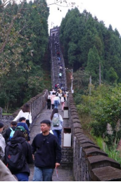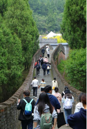 长城是依山势而建的,随着海拔高度的增加,空气愈发清新,景色愈发壮美,难度也愈来愈大。经过一段平缓地带后,我们迎来了险峻的石梯路段,面对陡峭崎岖的道路,师生同志互帮互助,携手并肩,协力前行,展现出了坚韧不拔的毅力和团结协作的精神,成功登顶并拍照留念。“世上无难事,只要肯登攀”,中华民族历经艰难险阻,行至今日取得的一系列成就,都是向上攀登得来的。我们作为新时代的建设者,要有排除万难、夺取胜利的坚定信念。