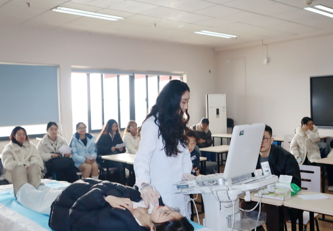 体验考古实验室后,大家统一前往623教室,体验超声检查。华西的医生一边操作一边讲解,让同学们学习到一些常见医学术语和医学知识。
