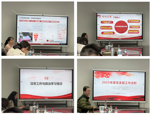 为深入学习贯彻习近平新时代中国特色社会主义思想特别是习近平总书记关于党的建设的重要思想,扎实开展“三个一流”创建活动,不断增强党支部政治功能和组织功能,2026年1月12日下午,历史文化学院2025年度党支部书记述职评议考核会于江安文科楼二区517会议室举行,会议由院党委书记王果主持,院党委副书记姜华,副院长鲍成志、王煜、黄博,学院党委委员、专职组织员及各党支部书记20余人参加会议。