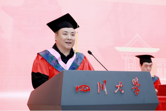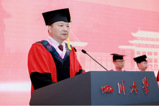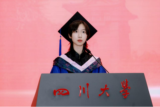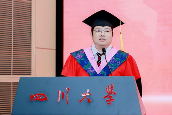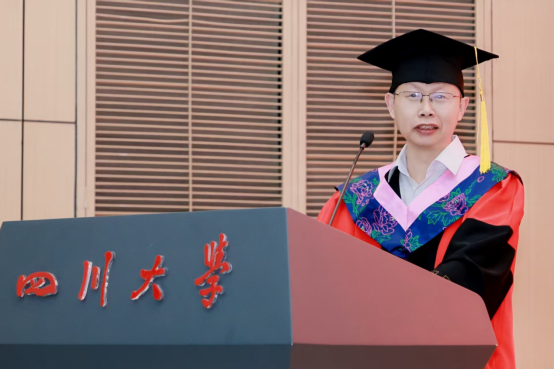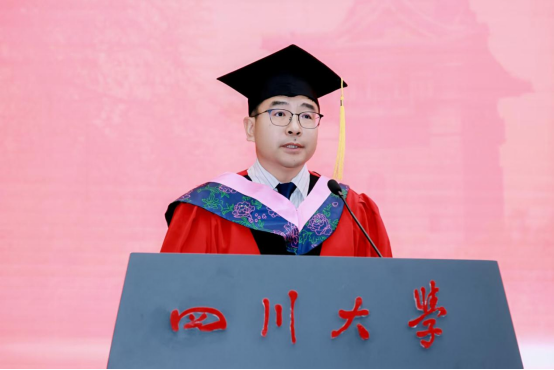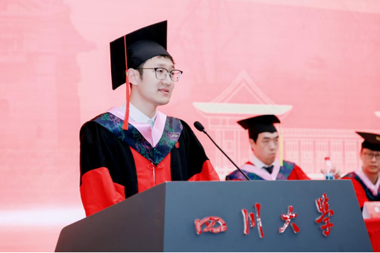 2021 级博士毕业生赵振中作为博士毕业生代表发言。他回忆2017年入学时的青涩憧憬,从迎新场景到开学典礼,勾勒出梦想起航的瞬间。谈及硕博七年,他感慨 “时间很长又很短”:长到总觉得有做不完的课堂汇报、写不完的课程作业,搜集不完的数据,修改不完的审稿意见……曾在文科楼通宵赶PPT,在导师指导下反复打磨申报书,从学术汇报时的紧张到从容应答……短在未及尝遍食堂窗口、踏遍校园角落便已迎来毕业。七年里,他深刻体会到川大 “海纳百川” 的氛围滋养着学子以惊人的速度成长,或是收获成果与爱情,或是在挫折中蜕变,又或是调侃着发际线后移、保温杯里的枸杞等,这些都是学子们成长的印记与“代价”。临别之际,他致谢母校栽培、师友陪伴,并以“鹏北海,凤朝阳,又携书路茫茫”,祝福母校如锦江奔涌,恩师学术长青,同窗跃入人海仍风雨灿烂。