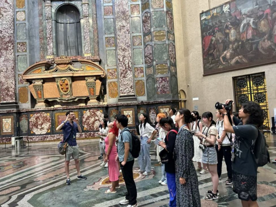 Piccardi带领同学们实地参访了佛罗伦萨的圣洛伦佐圣殿,并提供了有关建筑细节和美第奇家族历史的详细讲解。这座教堂是美第奇家族的私人墓地,由布鲁内莱斯基、多纳泰罗、米开朗基罗等著名艺术家参与设计建造,具有极为独特的艺术风格。