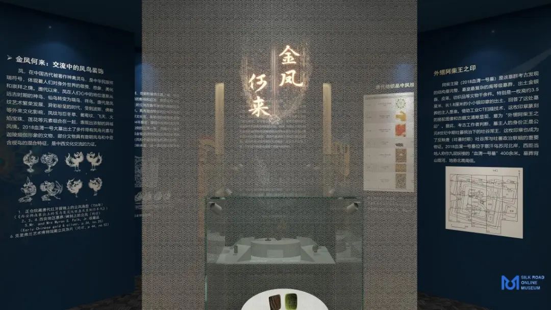 “当第一场发生在阳关的离别开始的时候,丝绸之路上的重逢已经埋下伏笔。”展览以“送别之地”阳关为起点,以丝路沿线人、物互动中的音乐诗词为明线,“凤鸟”纹饰流变为暗线讲述各民族文化的交融与发展,融入展示文物的收藏史、学术史及相关工艺史,由古及今、从局部到整体回望盛唐丝绸之路。阳关一别,殊途同归,展览创新地自序厅将动线分为“西向殊方”和“东往长安”两条线路交由观众选择,展示沿线艺术与风物,共同在高原丝绸之路的整体关联中加深对丝绸之路民族交流与世界交往的理解,最后同归尾厅,使用各地乐器共同完成一曲古今中外协奏曲,站在当下回溯各地唐代时期丝绸之路相关展览与研究、“丝绸之路:长安-天山廊道的路网”的申遗纪念,邀请观众沉浸式体验唐朝时期陆上丝绸之路、高原丝绸之路的文化交流与互助共赢,感受到殊方异色和锦绣盛唐的同频共振。