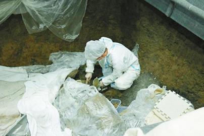 对来自成都文物考古研究院的蒋璐蔓来说,这次助力三星堆更是挑战自己的定力和耐性。今年30岁的她已是一员从事象牙与环境保护的“老将”。三星堆5号坑发现大量散碎的象牙器残片,她从今年1月开始便应邀助阵进行提取工作。3000多年前的象牙器存在被火烧过的情况,既小且脆。他们只能在悬空的操作平台上跪着作业。先用水小心把残片周围的土润湿,再用刃口只有0.2厘米左右的竹刀 一点点清理泥土,最后把象牙残片加固后才和泥土一起取出。碰到难度大的,一件残片提取就要花一两个小时。“这个急不得。”蒋璐蔓说,“象牙强度很低,一不小心就会碎掉。作为考古人,我们希望尽最大努力保护它们。”