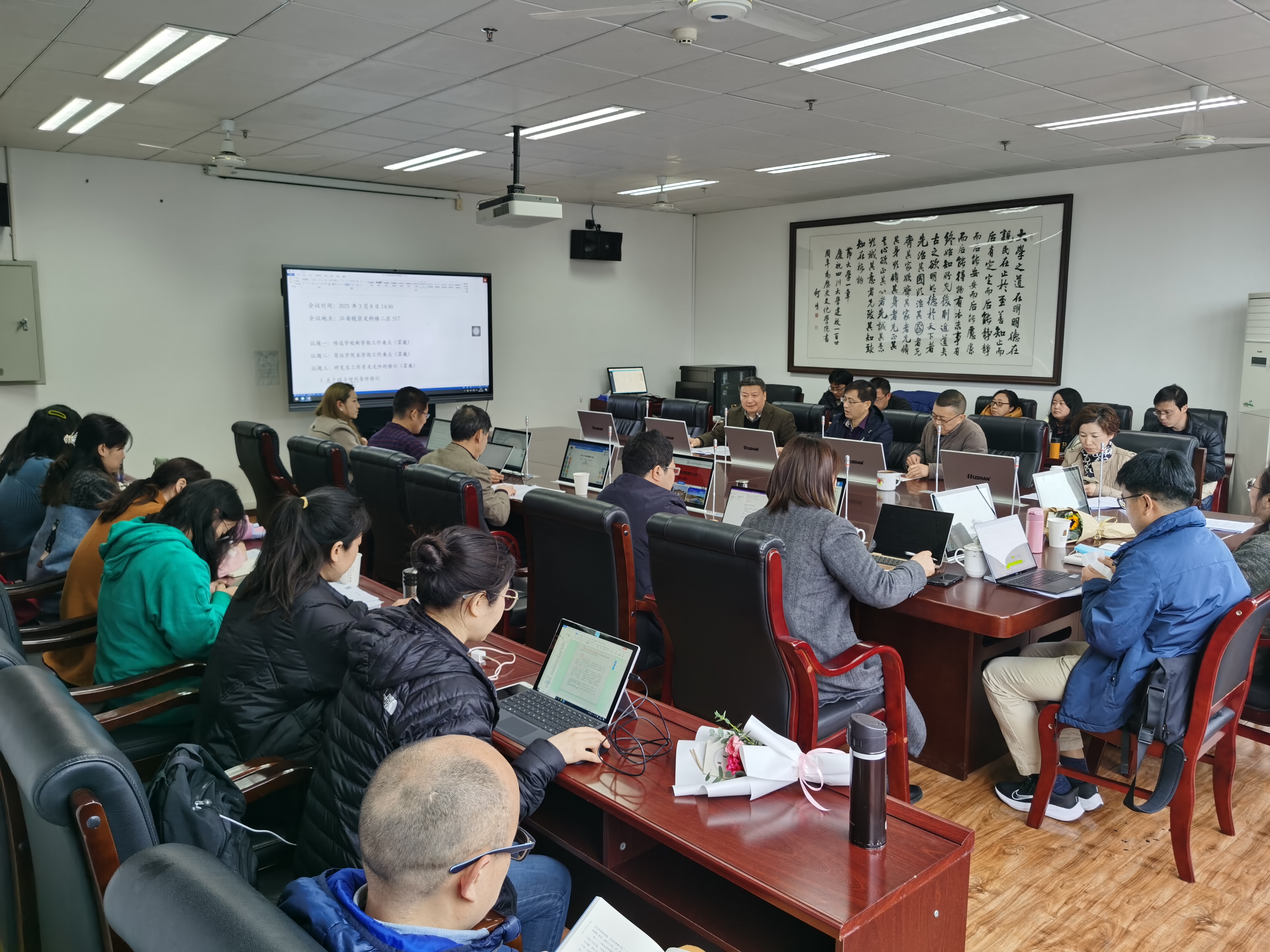 3月8日,我院2021年度工作布置会在江安校区文科楼二区517举行, 会议传达了学校2021年度工作布置会和“双代会”精神,并对学院2021年度工作进行了安排部署。学院党政领导班子,各教研室主任、副主任,及全体行政人员参加了本次会议。