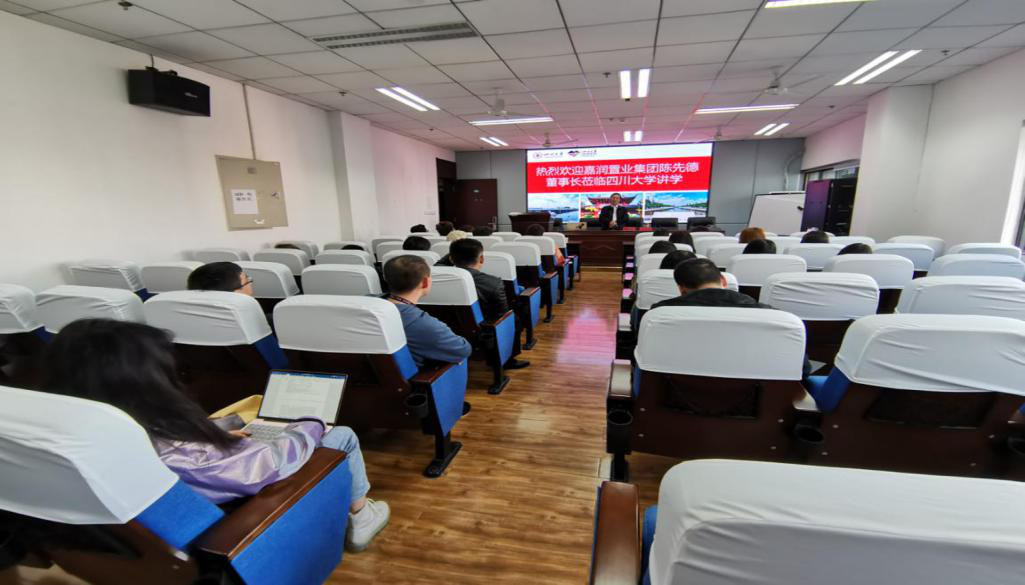 在主题演讲中,陈董事长首先为同学们介绍了成都嘉润置业集团公司的发展历程以及集团已经建成和正在建设的文旅项目。近年来,成都嘉润置业集团在习近平新时代中国特色社会主义思想指引下,充分发挥产业链源头优势带动产业跨界融合,着力打造了成都毛家湾森林公园、毛家湾艺术博物馆、荷花池半边街南丝绸之路文化街区、荷花池池上锦汉服文化产业街区、云南腾冲和顺里文化商业综合体、腾冲江东古银杏生态特色村等文旅产业融合项目,开创了新的文旅产业融合发展创新模式。接下来,陈董事长结合自己的成长历程,声情并茂的和同学们探讨如何实现人生价值和人生事业的高度融合,引导同学们树立正确的人生目标,努力做到“人生要有使命,为他人着想,在有限的人生里面做无限的事情”。