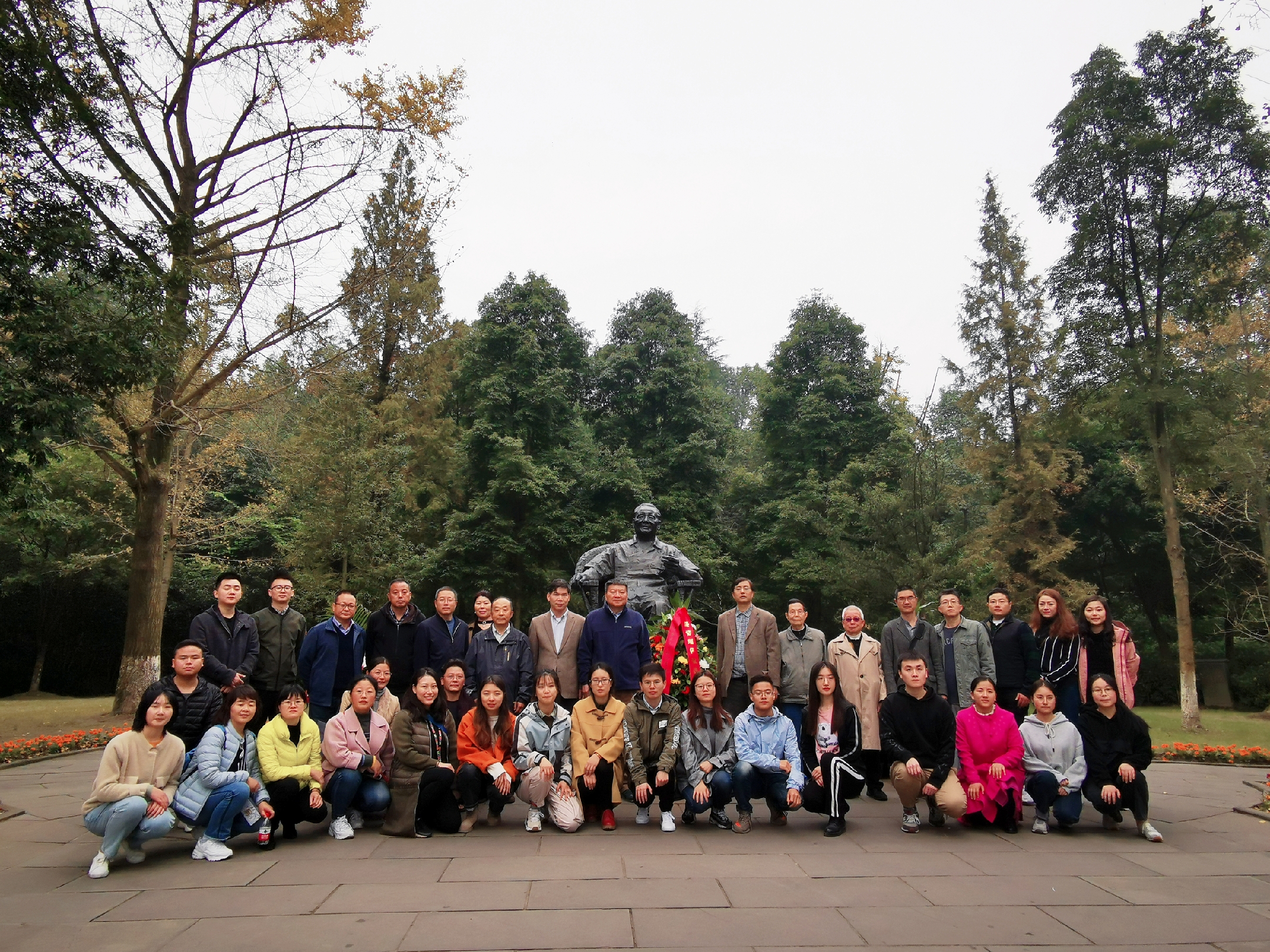 在邓小平铜像广场,我院一行在陶宏同志和霍巍同志的带领下向邓小平铜像敬献花篮,深深三鞠躬,绕行铜像一周并注目瞻仰,表达对邓小平同志的深切缅怀和崇敬之情。在敬献花篮活动结束后,全体党员与邓小平铜像合影留念。