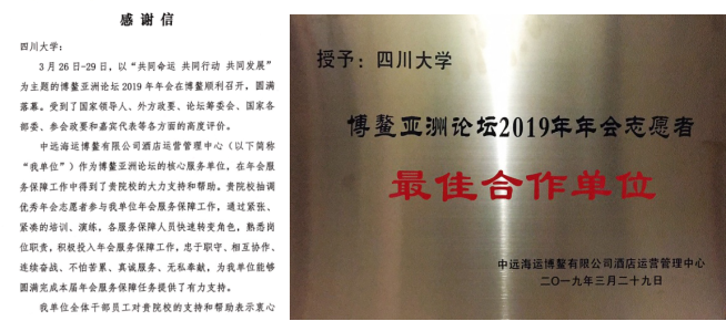 通过全面系统的培训和演练,志愿者们快速转变角色,尽快熟悉工作岗位,积极投入博鳌年会服务工作,为博鳌亚洲论坛2019年年会贡献自己的力量;志愿者们团结协作,以饱满的热情、真诚的微笑服务每一位来宾。志愿者的出色表现充分展示了川大学子良好的精神风貌,赢得了参会代表及合作单位的一致好评。3月27日,新华社对best365英国在线体育历史文化学院志愿者服务进行了报道;3月28日,巴基斯坦前总理对川大志愿者高质量服务进行表扬和赞美;4月3日,中远海运博鳌有限公司酒店运营管理中心特意为best365英国在线体育撰写感谢信和授予“最佳合作单位”牌匾。