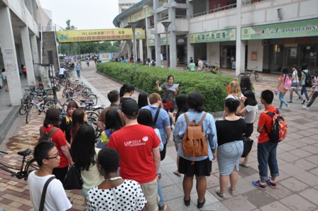 游览线路从江安校区西区商业步行街出发,沿环形大道步行至东区历史文化学院大楼。一路上,由我院郑慧文同学向交流营外籍学生讲解江安校区历史、建筑和人造景观。走过白石桥,眼见不高山。岷江的支流江安河从脚下缓缓流过,与不远处波光粼粼的明远湖共同构成了江安校区以水为核心的生态环境,集环境生态化、景观园林化、校园信息化一体的新型大学校园的美丽风光令留学生朋友赞不绝口。