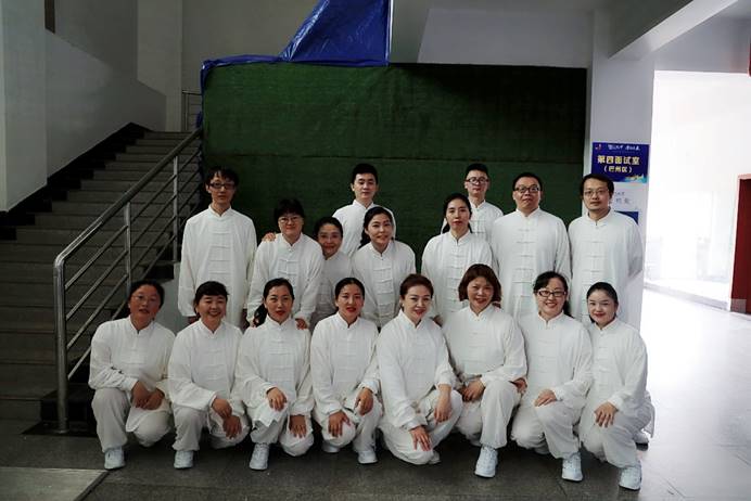 历史文化学院(旅游学院)教职工代表队是第五组出场的代表队,教职工代表们身着白色太极服,精神饱满、步履坚定。随着背景音乐,他们动作标准、缓疾相参、动静互辅、协调统一,场内观众席不时发出掌声与喝彩。
