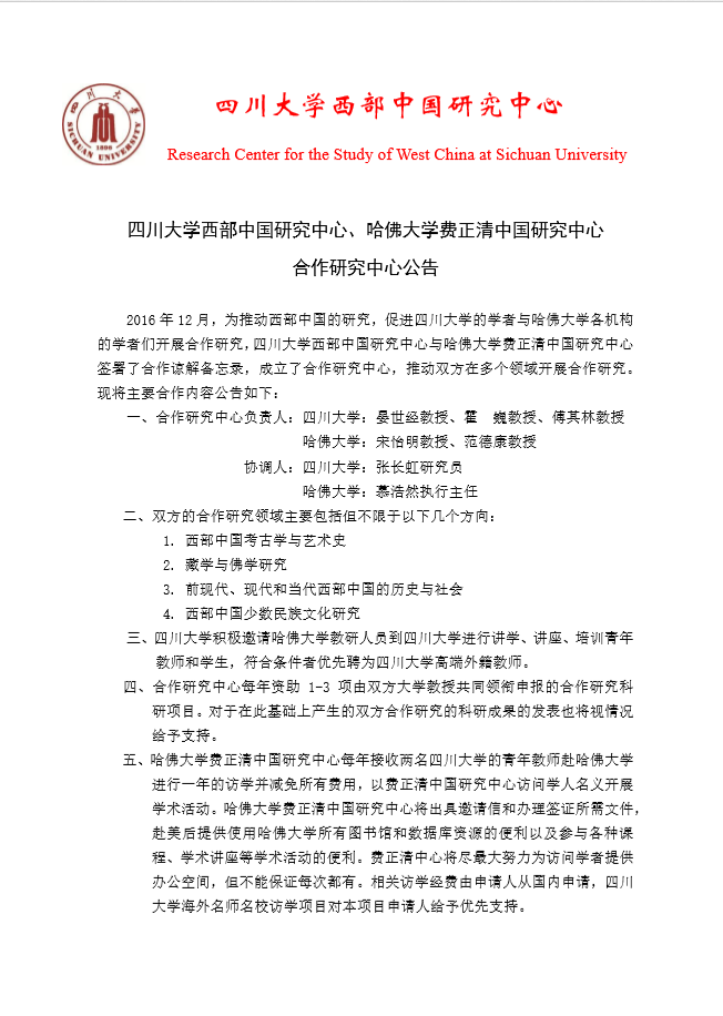 best365英国在线体育西部中国研究中心、哈佛大学费正清中国研究中心 合作研究中心公告